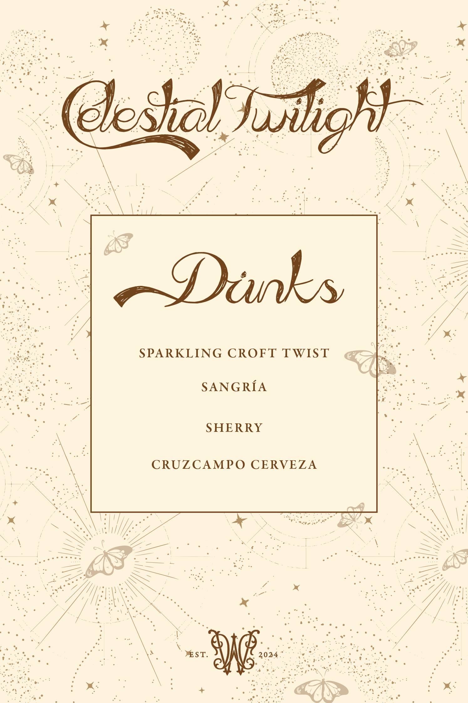 Created an elegant celestial inspired menu featuring hand lettered typography and subtle cosmic illustrations. Designed with a warm, vintage aesthetic to highlight specialty beverages and the cruinse for the evening in a refined yet ethereal style.