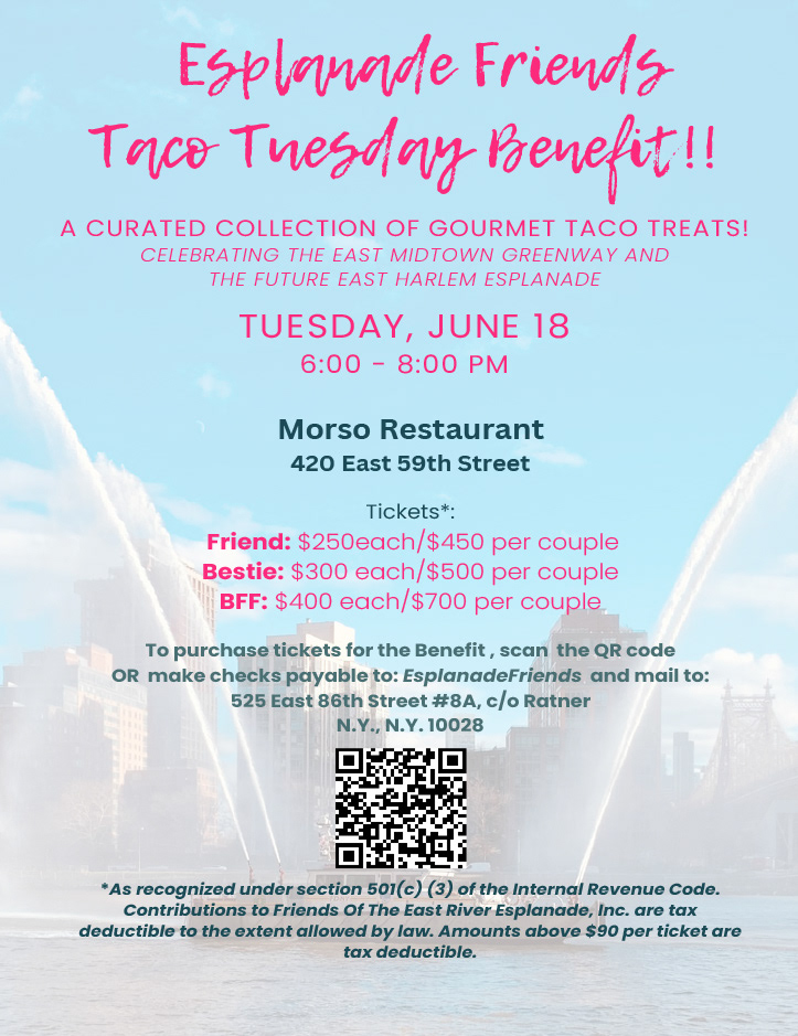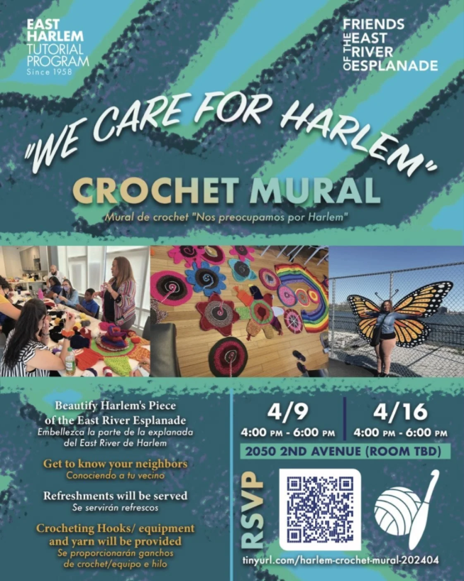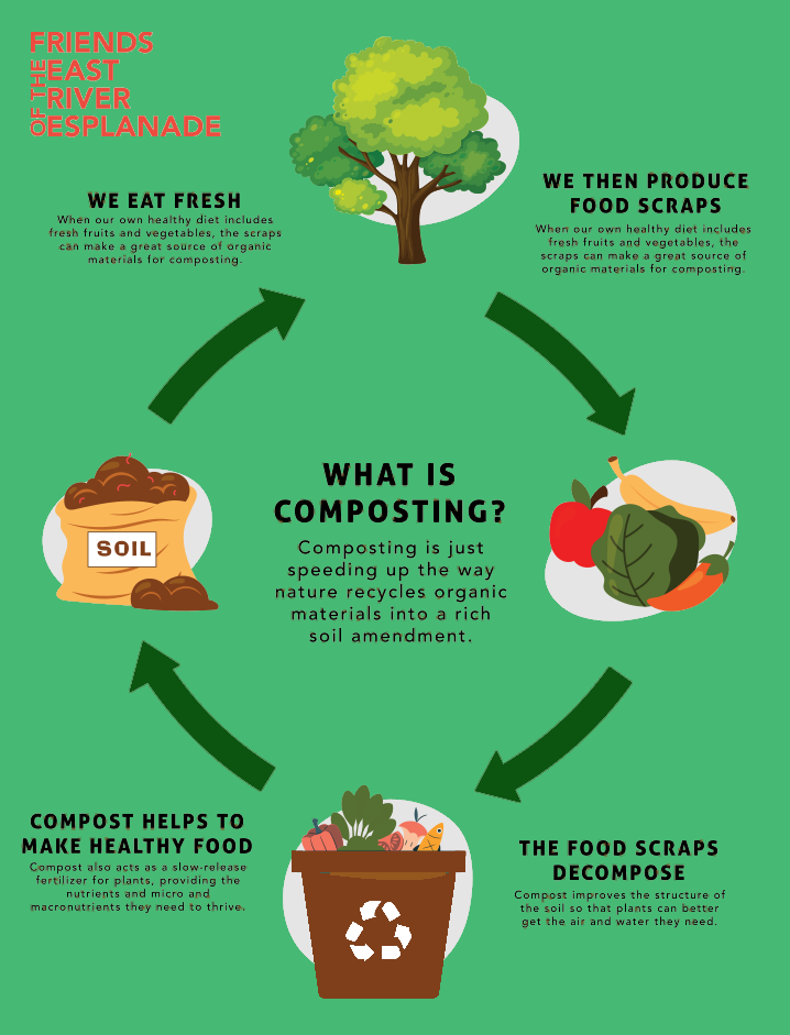 The mission of Friends of the East River Esplanade is to advocate, maintain, and provide environmental community programming on the East River Waterfront. An series of promotional graphics informing the community about the gardening, composting, yoga classes, and live music concerts they offer.