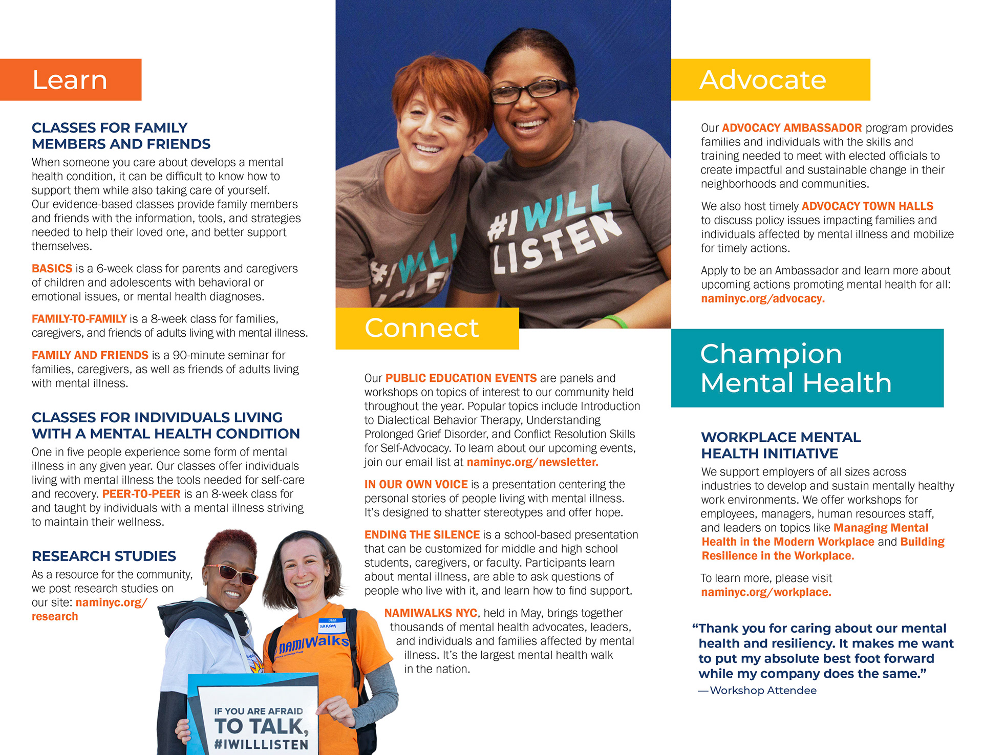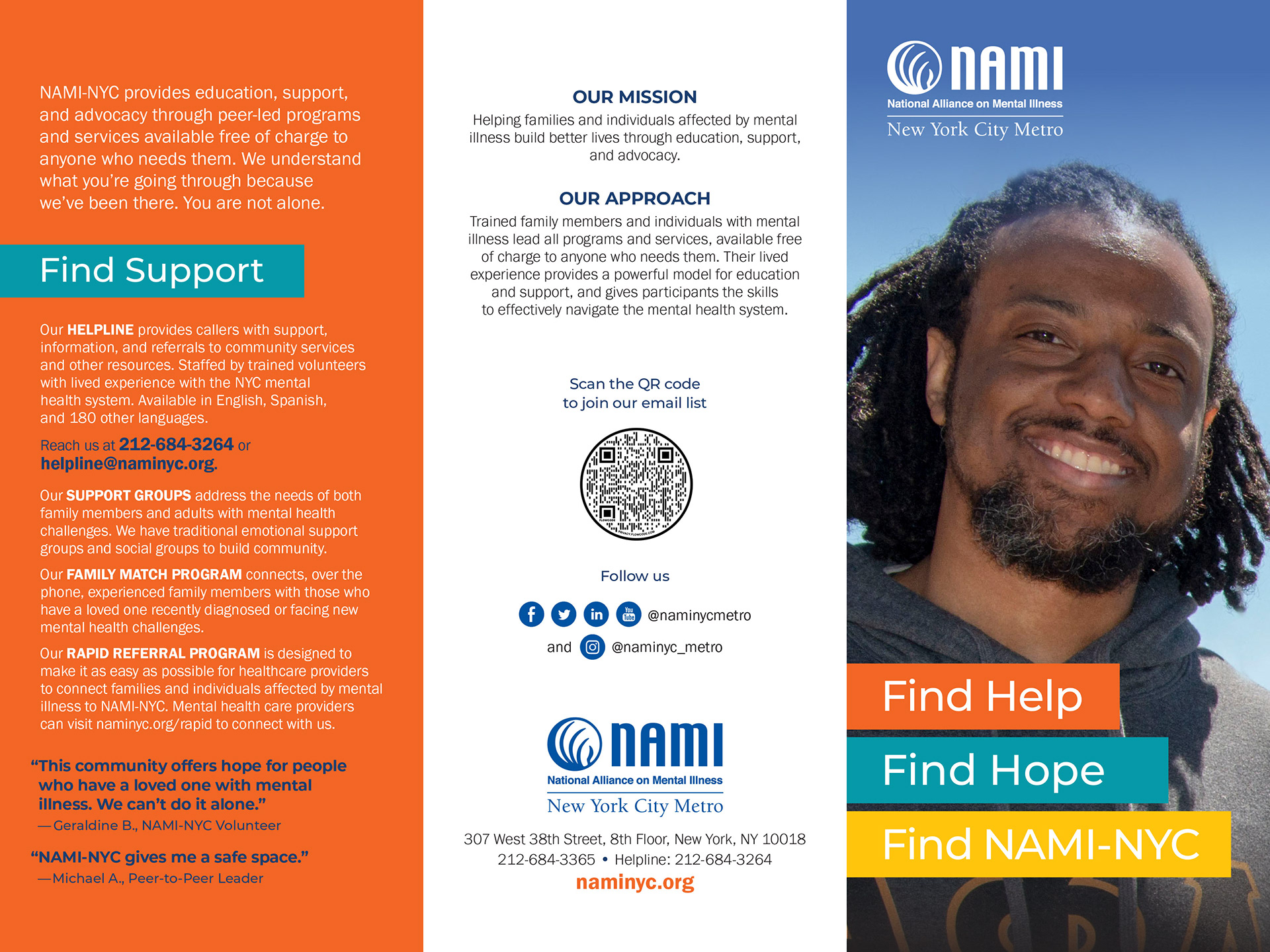 Designed a pair of trifold brochures for the National Alliance on Mental Illness, combining clean typography, vibrant color blocking, and engaging photography to communicate resources, programs, and support services while reflecting the organization’s mission of hope, advocacy, and community connection.